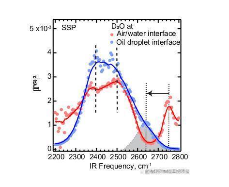 下图显示了分散的十二烷油滴(蓝色圆圈)和空气-水界面(红色圆圈)的界面水(DO)光谱。(使用重水稳定了实验条件,并将运行时间减少了约40%。)水分子的振动频率偏移部分取决于与相邻分子氢键的强度。2400 cm^-1和2500 cm^-1处的垂直虚线标记了氢键影响水的氧-氘键的频率边界。两个接口的峰值频率范围大致相同。