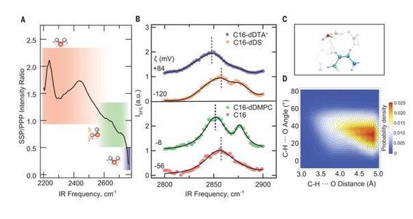综上所述,疏水油滴接触界面水结构的特征是水和油分子之间的电荷转移相互作用,这种电荷转移作用源于非常规的C-H···O H键。与平面气-水界面相比,油滴表面的水具有更强的H键网络。界面O-D和C-H的光谱位移为水向油的电荷转移提供了证据,解释了裸油滴在水中的负电荷和稳定性。