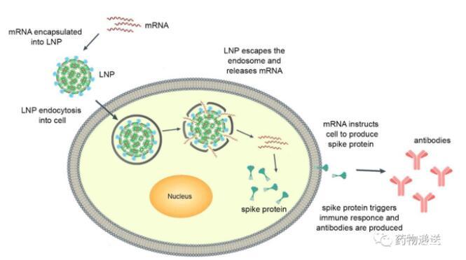 脂质纳米粒最新的成功案例是作为递送载体用Pfizer/BioNTech和Moderna获FDA批准的两种COVID-19信使RNA(mRNA)新冠疫苗,这两款疫苗以无与伦比的速度开发上市,并在流行病毒预防方面有着显著的效果。疫苗将编码SARS-CoV-2刺突蛋白的mRNA递送到宿主细胞的细胞质中,被翻译成刺突蛋白充当抗原,对病毒产生免疫反应。