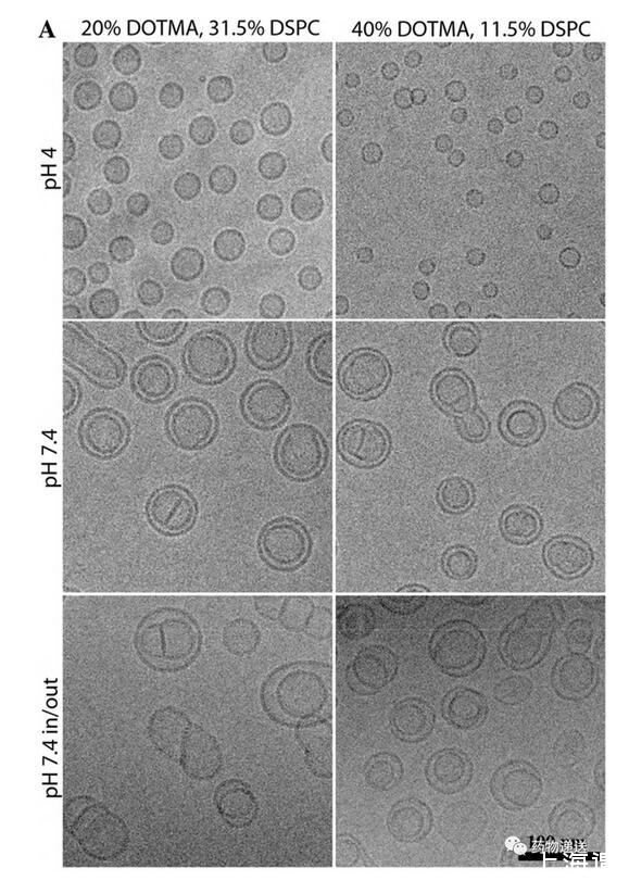 此外还发现,采用乙醇稀释/快速混合技术制备LNP-siRNA,当siRNA含量较高时,表现为堆叠的小双层结构,其中siRNA被包载于紧密相连的脂质双分子层之间;当siRNA含量较低时,堆叠结构的比例降低,LNP-siRNA复合物系统则表现出siRNA双层结构和非晶态电子致密核的组合,这可能是由中性形式的可电离阳离子脂质产生的油滴而形成。所得结论为:含可电离阳离子脂质的LNP体系在pH=4时形成双层结构,在pH=7.4时形成非晶态“固体核”结构。