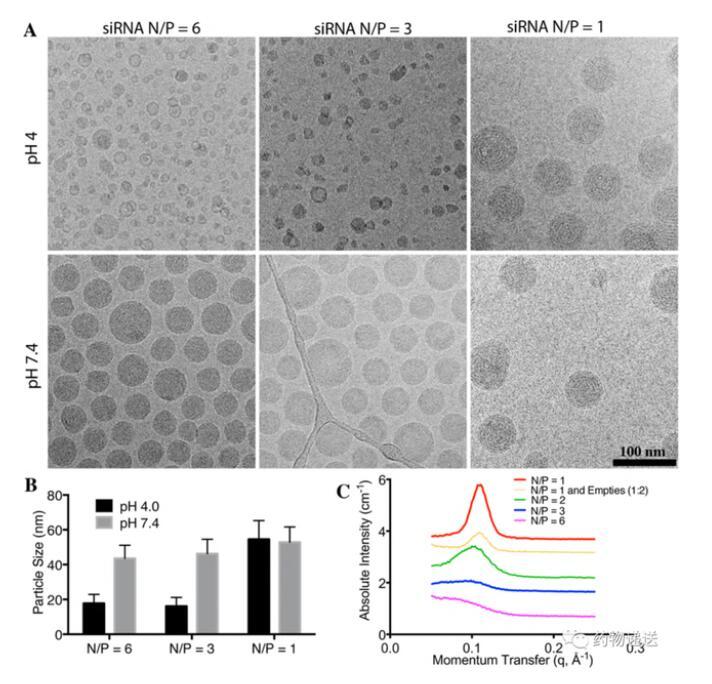 使用带电荷脂质制备siRNA-LNP时,正电荷与负电荷的数量比会影响纳米粒的大小、稳定性、电位等性能。在siRNA-LNP中,正电荷通常为具有可电离铵根(N)的阳离子脂质,而负电荷则为带有大量磷酸根(P)的核酸分子,两者可通过静电吸附的方式结合在一起。因此,不合理的比例可能会导致粒径过大、稳定性差等缺陷。值得一提的是,在研究中发现,当N/P=1时,pH中和后LNP的粒径不会有较大改变;当N/P=3或者6时,LNP在pH=7.4的缓冲液中粒径会变大。而永久阳离子脂质(例如DOTAP)制备的LNP在任何pH缓冲液中都不具有固体核心结构。