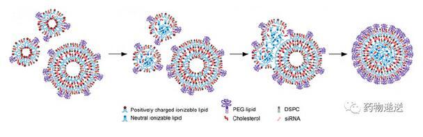 在有siRNA存在的情况下,最初是在紧密相连的脂质单层之间形成包含siRNA的小囊泡;随着pH值的升高,类似于不含siRNA的LNP,可电离脂质电位的中和会诱导脂质颗粒间的融合,这个过程受到复合物中PEG脂质、DSPC和胆固醇的相分离限制;有科学家提出,这些脂质沉积在表面单层,抑制脂质颗粒进一步融合。值得注意的是,高浓度乙醇(体积比不小于25%)会导致除单个脂质分子的高交换率(与siRNA复合的阳离子脂质除外),从而使得快速形成平衡结构;还需要指出的是,必须要有部分DSPC和胆固醇被分割在外单层,并且在pH=4时能维持更小结构的稳定,因为在含有1.5 mol % PEG脂质且没有DSPC或胆固醇的体系中能观察到非常大的微米级系统;随着pH的升高,纳米颗粒经历的过程与不含siRNA时LNP的情况基本相同;可电离脂质向中性形式转化的过程更利于增加在LNP内核中的融合和沉积。