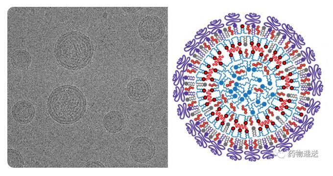 LNP-siRNA复合物是通过快速混合-乙醇稀释过程形成,该复合物并没有显示出倒置的胶束结构,其中siRNA以“醋栗小圆面包”(currant bun)的形式分散在LNP内部。相反,siRNA与紧密贴合的脂质双层膜相关,双层脂质膜固定住siRNA分子,分离到LNP的外围。过量的可电离阳离子脂质会形成一个无定形的脂质核心,类似于含有一定量胆固醇的油滴相。