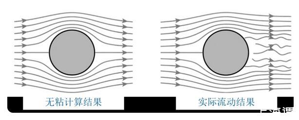 欧拉提出欧拉方程后不久,人们就认识到方程中缺乏粘性项,这会导致欧拉方程的计算结果和实际产生偏差,比如大家熟知的达朗贝尔佯谬。下图显示了理想流体和实际流体下圆柱绕流的对比,可以看出,无粘流动的结果和实际存在很大的差异。因此,如何在流动方程中添加粘性项成为了跨越百年的流体力学难题。