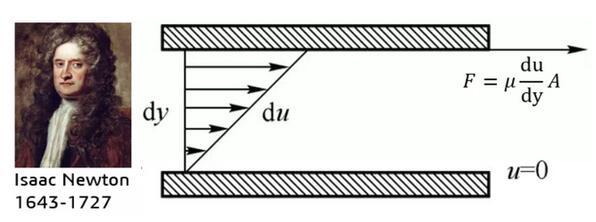 正如前面所说,人们很早便感受到了流体具有“粘”的属性,但是如何从科学上表达流体的粘性成为了一个新的问题。作为世界物理学界金字塔尖的男人,牛顿几乎霸屏了整个中学物理课本,当然也没有放过流体。1686年,牛顿经过大量的实验研究,提出了著名的“内摩擦定律”——流体的内摩擦力(即粘性力)的大小与流体的性质(粘性系数μ)有关,并与流体的速度梯度和接触面积成正比。