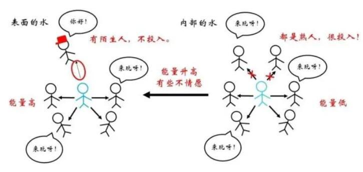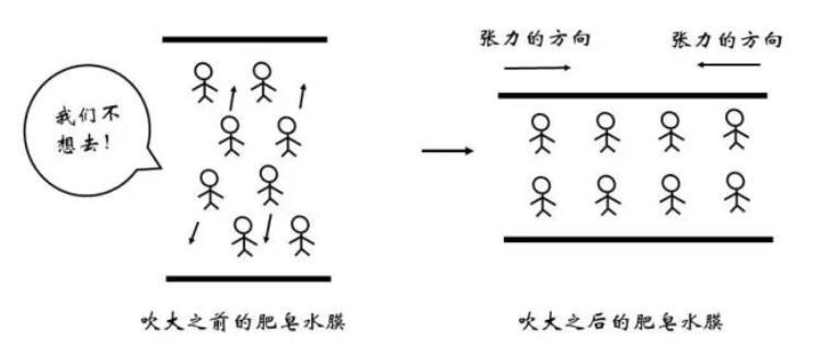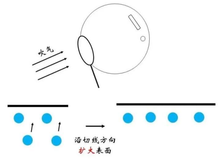 俗话说“物以类聚,人以群分”,更加相似的同类分子间往往关系更为融洽,而不同种分子间的关系则相对疏远。在物理上表现为同类分子间的势能曲线最低点更低。因此,对于一个存在于内部的水分子,如果来到表面,需要断开与同类分子的部分关系,而代之以与比较“生疏”的空气分子间的作用,显然是不情愿的!这体现为能量的升高。那么,什么情况下水分子要从内部来到表面呢?正是吹泡泡的时候。