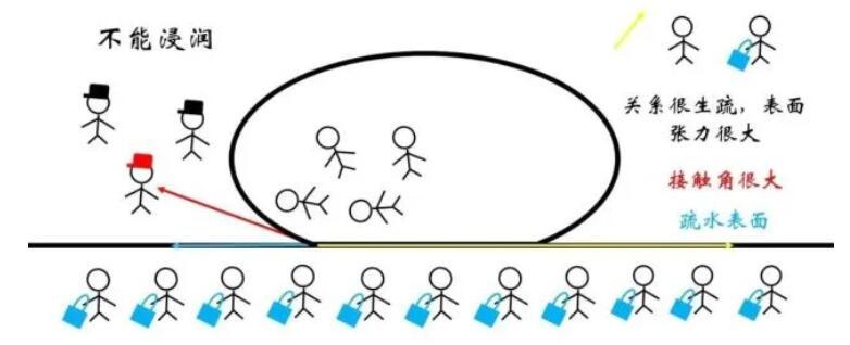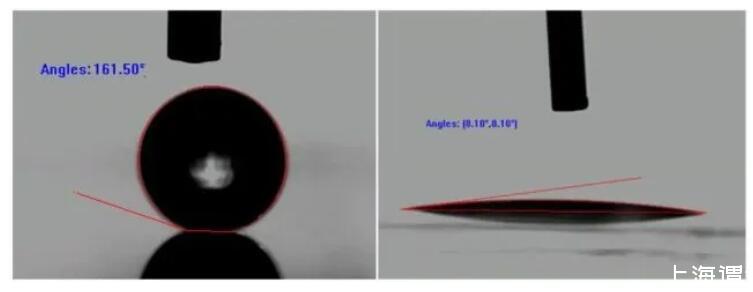 反之,对于疏水表面,固液界面处的表面张力可能非常大,以至于接触角只有达到钝角甚至趋近于180°才能达到平衡,此时的现象称为非浸润或者不能浸润。而这种表面由于较高的疏水性被称为超疏水表面。