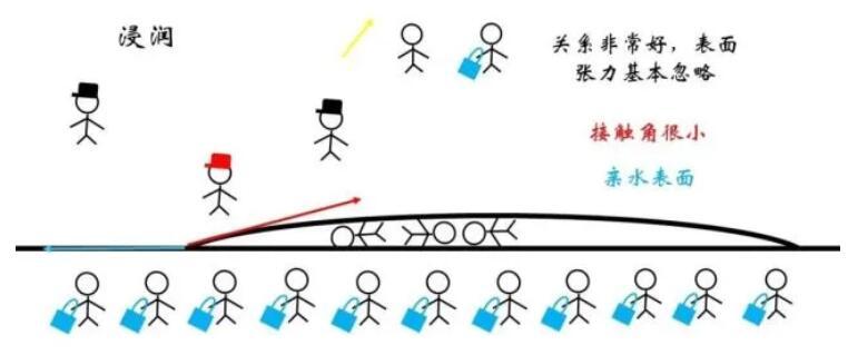 对于浸润的情况,液体与固体物质间的关系很好,最为极端地可以认为该界面处的表面张力小到可以忽略。这样一来,需要红色和蓝色的力的水平分量达到平衡,液滴的形状趋于扁平。一般将气液界面处张力与液固界面的夹角称为接触角,对于浸润现象显著的亲水表面接触角很小。
