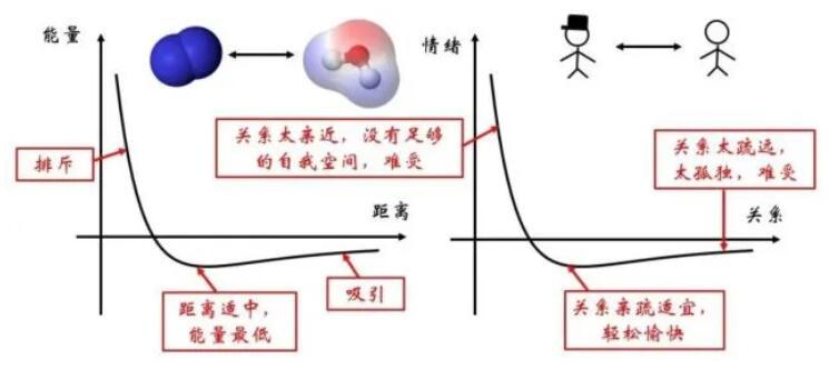 在微观世界存在着多种多样的分子,比如上图所示的氮气与水分子。分子间组成的体系的势能与分子间的距离有关。这种关系正如两个人之间的关系,远了近了都不好。如果距离太近,彼此之间没了自我空间,情绪会不稳定,因此会产生相互排斥的作用;如果距离太远,每个人都太孤独,便会相互思念,彼此吸引。当彼此的距离恰到好处,便对应着能量的最低点,较为稳定。