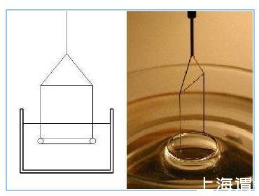 挂环法(Du Nouy Ring method):这可能是测量表面/界面张力的最经典方法,文献上报道的许多液体的表/界面张力值是用这一方法测得,它甚至可以在很难浸湿的情况下被使用。用一个初始浸在液体的环从液体中拉出一个液体膜(类似肥皂泡),同时测量提高环的高度时所需要施加的力。
