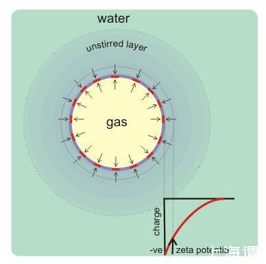 纳米气泡也存在比较强的静电场,能避免气泡发生融合,对抗浮力作用。在水平电场中,气泡电荷决定于水平速度v=ζε/μ(v=水平速度,ζ=zeta电位(V),ε=水的介电常数(s2×C2×kg-1×m-3),μ=粘滞度(Pa×s).)