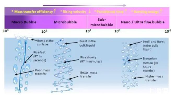 气泡表面积和气泡直径呈负相关关系,(表面积A和直径D的数学关系A=6/D)。因此同样体积的气泡,100纳米直径气泡表面积是10微米直径面积的100倍。