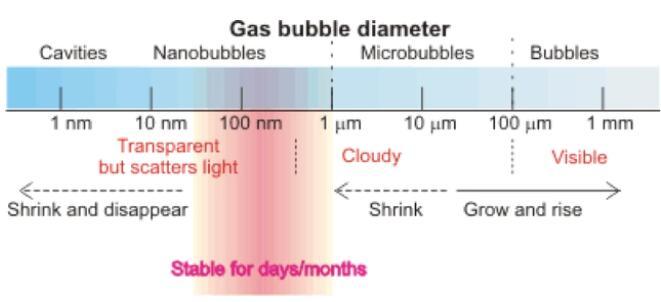 虽然气泡的研究历史已经超过半个世纪,但是气泡的类型和分类一直存在争议。学术上对气泡分类主要根据气泡性质的不同,最常用的指标是气泡大小、表面特征和气泡寿命。这些特征主要决定于气泡大小,因此许多学者把气泡大小作为唯一分类标准。按照这个标准,气泡被分为大气泡、微米气泡、亚微米气泡或纳米气泡,也有采用更通俗分类为大气泡、小气泡和超小气泡。虽然学者们对气泡的大小范围具体有不同看法,但大多数同意微气泡直径应该在10-100微米的范围,1-10微米为亚微米气泡,10-1000纳米为纳米气泡。