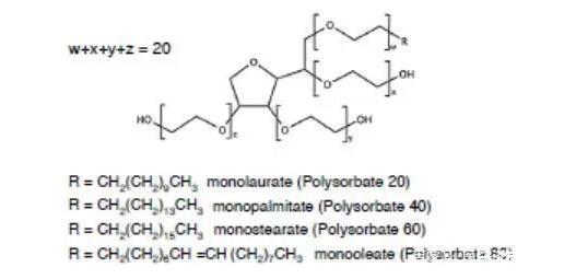 吐温(Tween或polysorbate)也是一类较为常用的非离子表面活性剂。脱水山梨醇作为中心结构,四条PEG链段的一端连接在中心单元上。其中一条PEG链段的末尾连接脂肪长链。吐温常见的型号一般为吐温20、吐温40、吐温、60和吐温80,这些表面活性剂中,PEG的重复单元数目总数为20,而PEG末端连接脂肪酸长链包括月桂酸、棕榈酸、硬脂酸和油酸。随着脂肪链长度的增加,疏水结构的占比增加,HLB下降,但是吐温是水溶性表面活性剂,这几个吐温的HLB通常都在15以上。吐温通常用于微乳、自乳化系统和固体分散体中。如果将吐温中的PEG链段去除或替换成脂肪长链,则得到了另一类表面活性剂,司盘。这是一类非水溶性表面活性剂,HLB通常小于10。