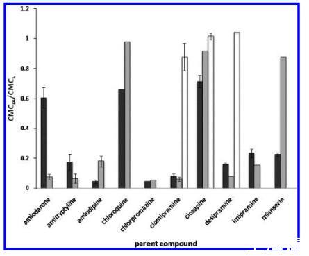 图5.CMC偏移(由CMC之间的比率表示)药物-脂质复合物(DL)和单独脂质的CMC(L):CMCDL/CMCL)的测试化合物(黑色)及其主要代谢物(灰色、初级代谢物;白色,次生代谢物)在pH 7.2中分析HEPES缓冲液。使用的药物浓度为1 mM,除非另有说明见表2。误差线被分配给那些n g3测试的化合物。对于氯氮平和米安色林,均为0.91和0.091 mM用于测试,但仅来自1 mM测试的数据被策划。