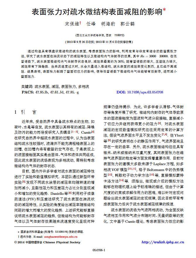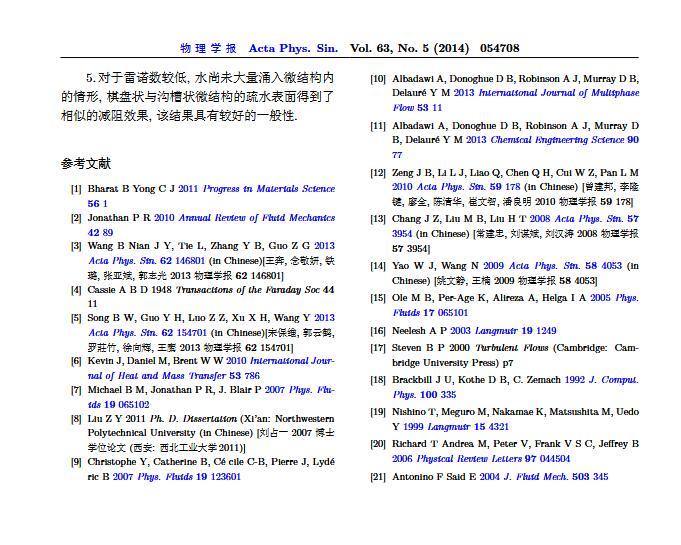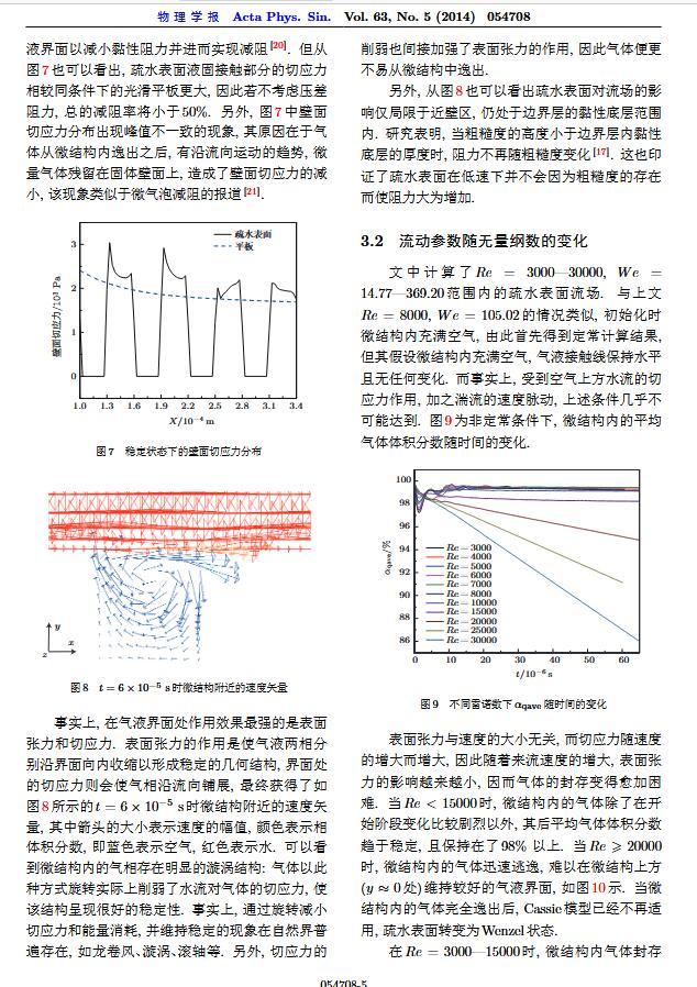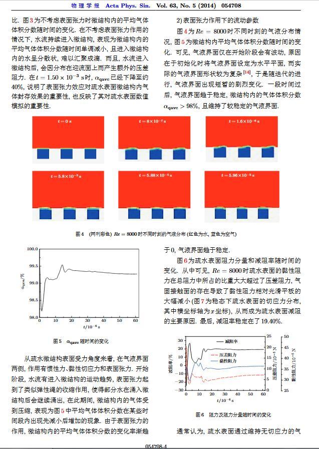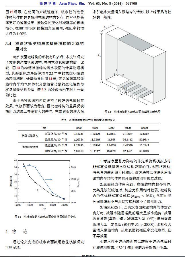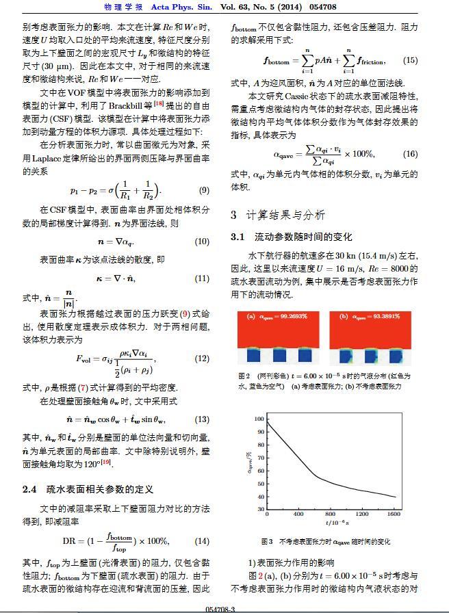 通过构造具有棋盘状微结构的疏水表面,考虑表面张力的影响,利用定常与非定常结合的数值模拟方法,研究了疏水表面在湍流状态下的减阻特性以及微结构内气体封存的效果,其中Re=3000—30000.在低雷诺数下,疏水表面微结构内气体封存状态良好,减阻率最高约为30%;随着雷诺数的增大,压差阻力增大,减阻率有下降趋势.当来流速度过大时,水会大量进入微结构,疏水表面的减阻率变化剧烈,且已经不再减阻.结果表明,表面张力削弱了壁面切应力的影响,使得低雷诺数下微结构内气体能够有效封存,进而减小壁面阻力.