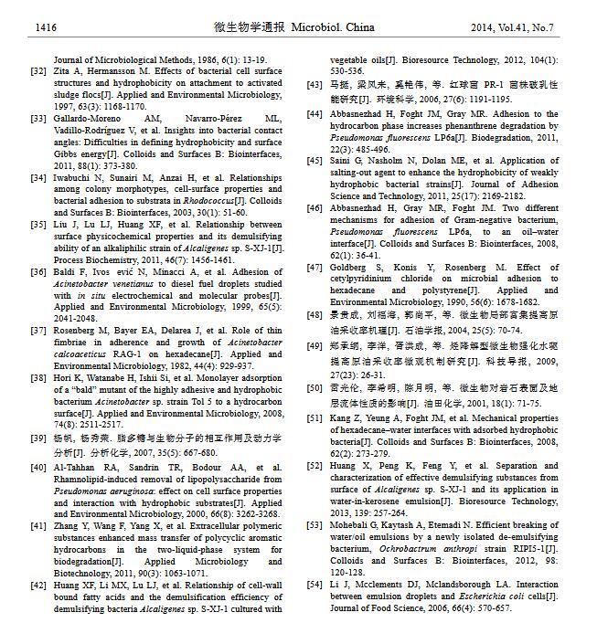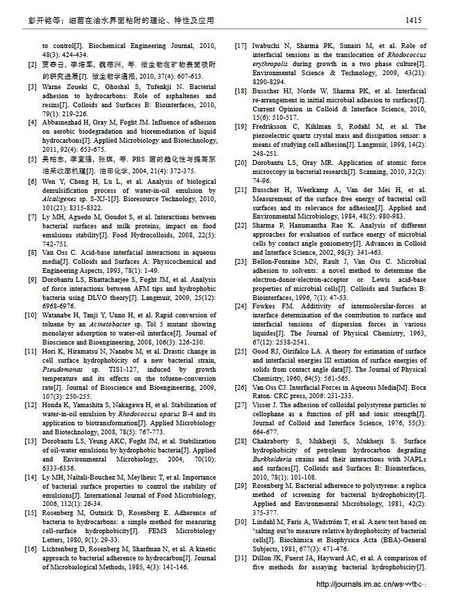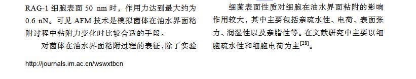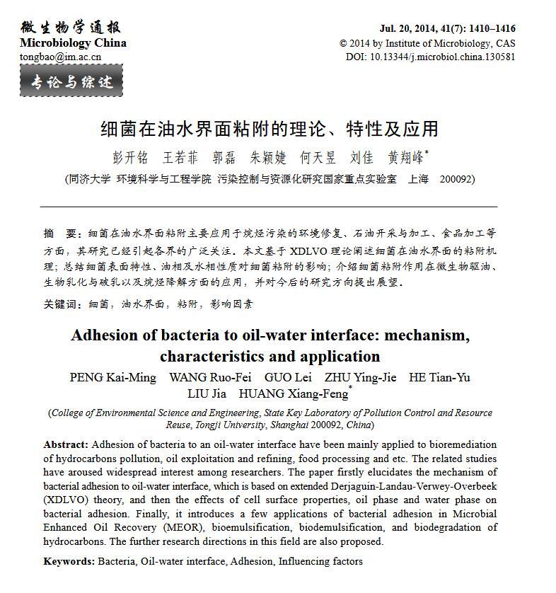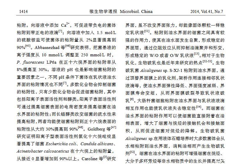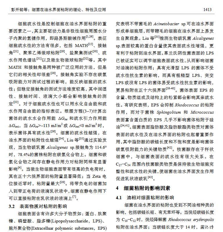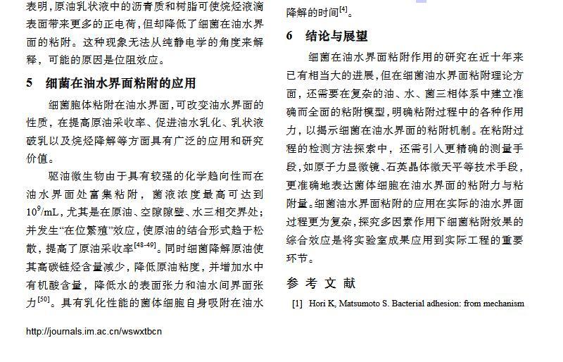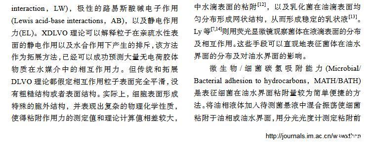 摘 要:细菌在油水界面粘附主要应用于烷烃污染的环境修复、石油开采与加工、食品加工等方面,其研究已经引起各界的广泛关注。本文基于 XDLVO 理论阐述细菌在油水界面的粘附机理;总结细菌表面特性、油相及水相性质对细菌粘附的影响;介绍细菌粘附作用在微生物驱油、生物乳化与破乳以及烷烃降解方面的应用,并对今后的研究方向提出展望。