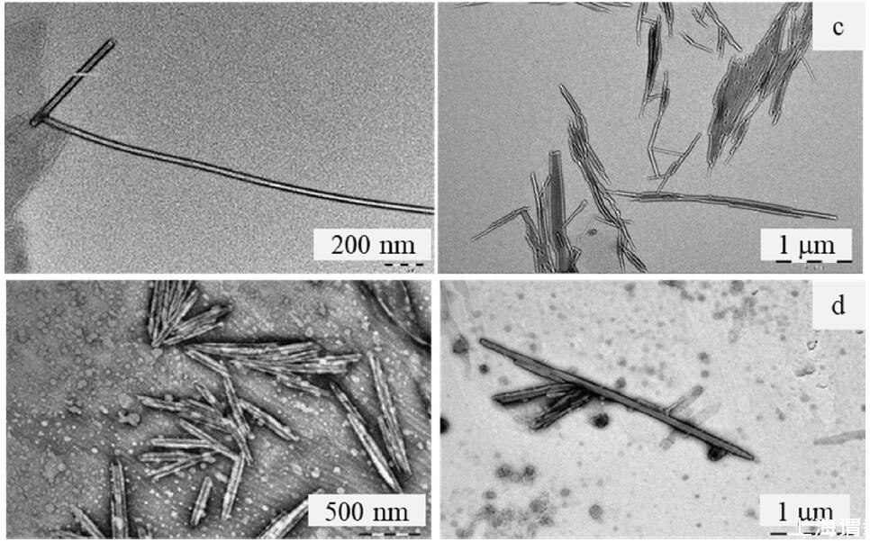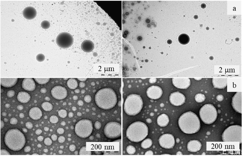 为了进一步证实这些大聚集体的形态,SCAG、SCAA、SCAS和SCOS水溶液的TEM显微照片如图3所示。SCAG和SCAA水溶液中形成球状囊泡,而SCAS和SCOS自聚集成管状囊泡。对于SCAG和SCAA,观察到的球形囊泡的直径分别约为1μm和100-200 nm,与DLS测量结果一致。SCAS和SCOS的小管长度L≤4μm,直径d≤40 nm和100 nm。这些与DLS结果一致,表明由SCOS形成的聚集体的等效流体动力学直径大于来自SCAS的聚集体。TEM结果表明聚集体的形态取决于氨基酸残基和疏水尾部的结构。对于源自蓖麻油的表面活性剂,疏水尾部的-OH基团促进了球形囊泡的形成;而对于丝氨酸头基上带有-OH基团的表面活性剂,小管更稳定。