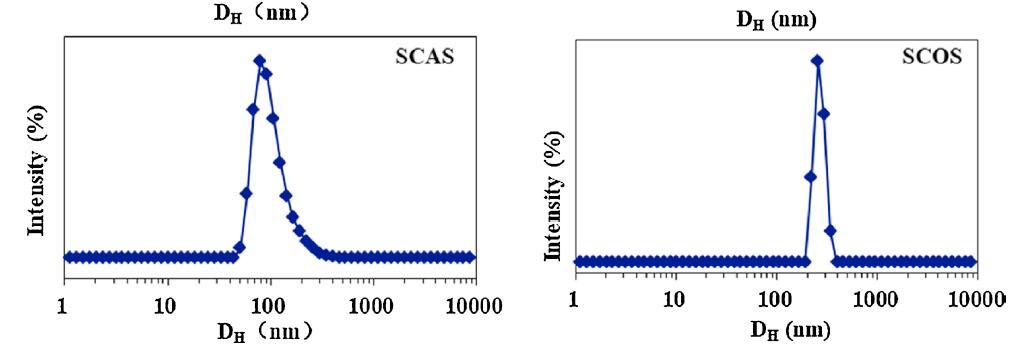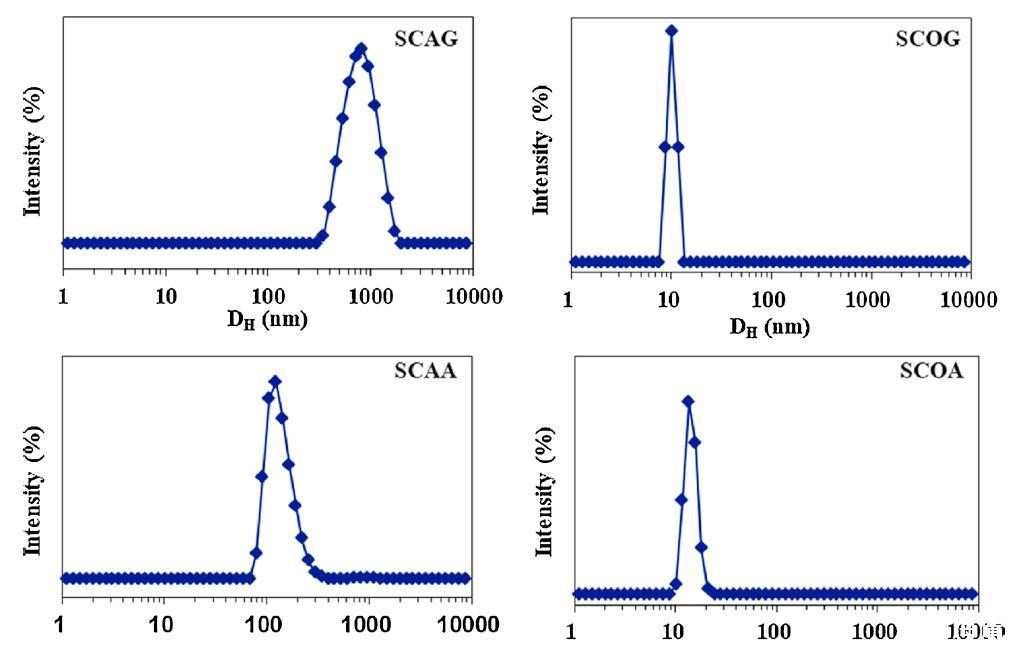 用DLS测量在6种酰基氨基酸表面活性剂水溶液中形成的聚集体的大小和分布,其CMC为5倍,5×CMC。图2显示了它们的表观等效流体动力学直径(DH)。除丝氨酸外,蓖麻油表面活性剂的DH分布普遍大于棉籽油表面活性剂的DH分布。SCAG和SCAA的DH分布分别集中在900和150 nm,而SCOG和SCOA聚集体的直径约为10 nm。对于丝氨酸,SCAS和SCOS的平均DH值分别约为100 nm和250 nm。这些结果可以通过蓖麻油衍生的表面活性剂的蓖麻油基和丝氨酸头部基团上都存在-OH基团来解释,促进了大聚集体,例如囊泡的形成(图2)。