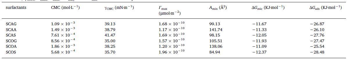表格1 6种酰基氨基酸表面活性剂在25℃下的CMC、γCMC、Γmax、Amin、ΔGads和ΔGmic值。