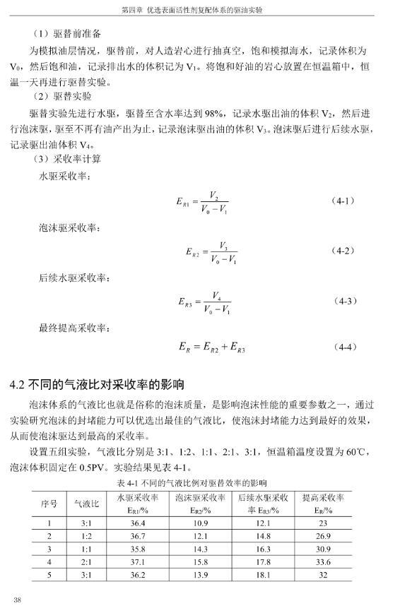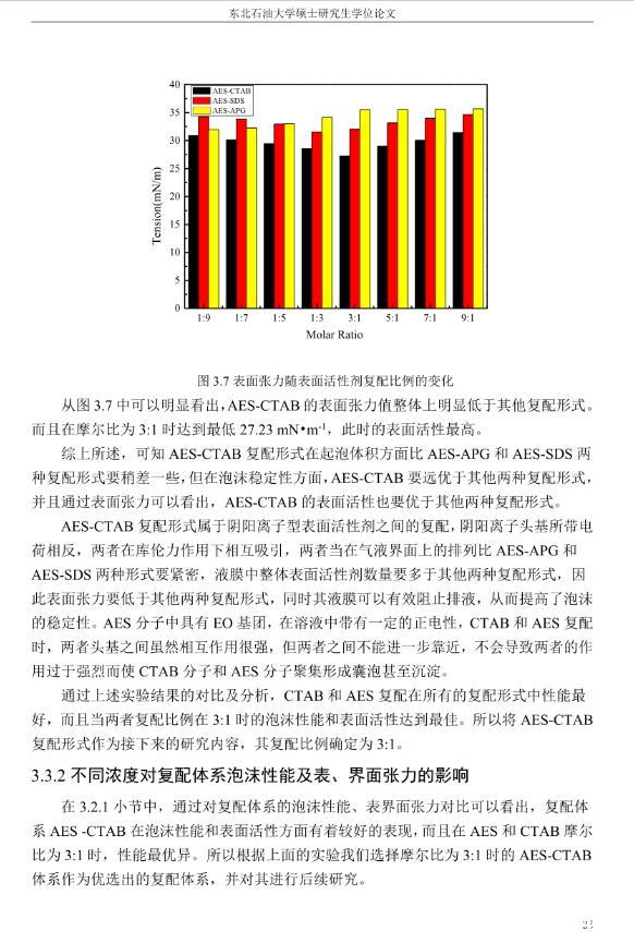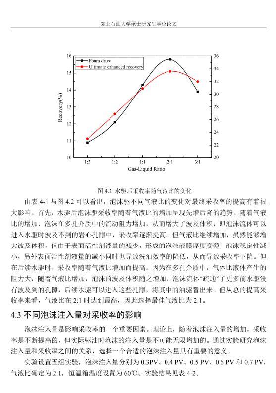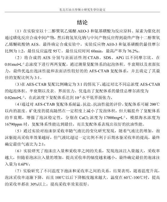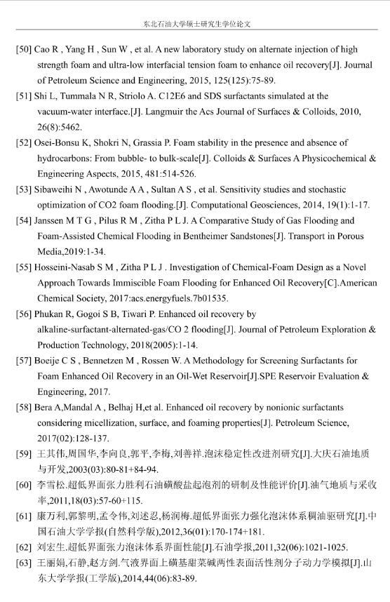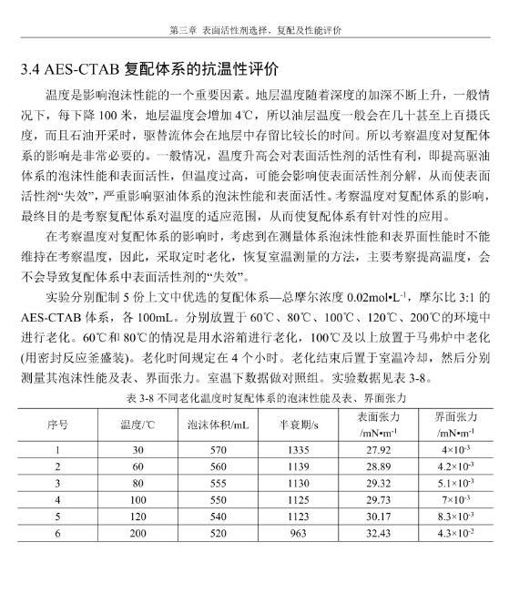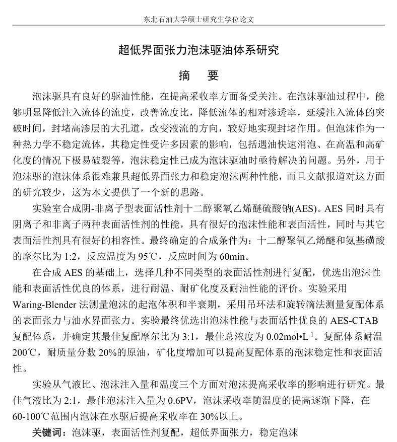 【摘要】:泡沫驱具有良好的驱油性能,在提高采收率方面备受关注。在泡沫驱油过程中,能够明显降低注入流体的流度,改善流度比,降低流体的相对渗透率,延缓注入流体的突破时间,封堵高渗层的大孔道,改变液流的方向,较好地实现封堵作用。但泡沫作为一种热力学不稳定流体,其稳定性受许多因素的影响,包括遇油快速消泡、在高温和高矿化度的情况下极易破裂等,泡沫稳定性已成为泡沫驱油时亟待解决的问题。另外,用于泡沫驱的泡沫体系很难兼具超低界面张力和稳定泡沫两种性能,而且文献报道对这方面的研究较少,这为本文提供了一个新的思路。实验室合成阴-非离子型表面活性剂十二醇聚氧乙烯醚硫酸钠(AES)。AES同时具有阴离子和非离子两种表面活性剂的性能,具有很好的泡沫性能和表面活性,同时与其它表面活性剂具有很好的相容性。最终确定的合成条件为:十二醇聚氧乙烯醚和氨基磺酸的摩尔比为1:2,反应温度为95℃,反应时间为60min。在合成AES的基础上,选择几种不同类型的表面活性剂进行复配,优选出泡沫性能和表面活性优良的体系,进行耐温、耐矿化度及耐油性能的评价。实验采用Waring-Blender法测量泡沫的起泡体积和半衰期,采用吊环法和旋转滴法测量复配体系的表面张力与油水界面张力。实验最终优选出泡沫性能与表面活性优良的AES-CTAB复配体系,并确定其最佳复配摩尔比为3:1,最佳总浓度为0.02mol·L-1。复配体系耐温200℃,耐质量分数20%的原油,矿化度增加可以提高复配体系的泡沫稳定性和表面活性。实验从气液比、泡沫注入量和温度三个方面对泡沫提高采收率的影响进行研究。最佳气液比为2:1,最佳泡沫注入量为0.6PV,泡沫采收率随温度的提高逐渐下降,在60-100℃范围内泡沫在水驱后提高采收率在30%以上。