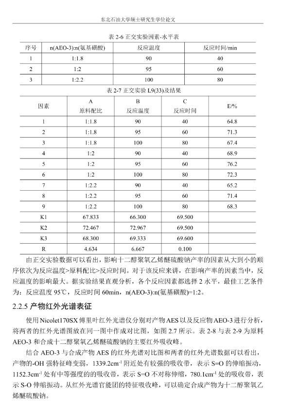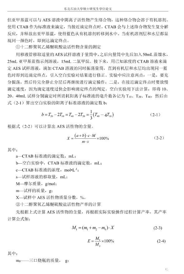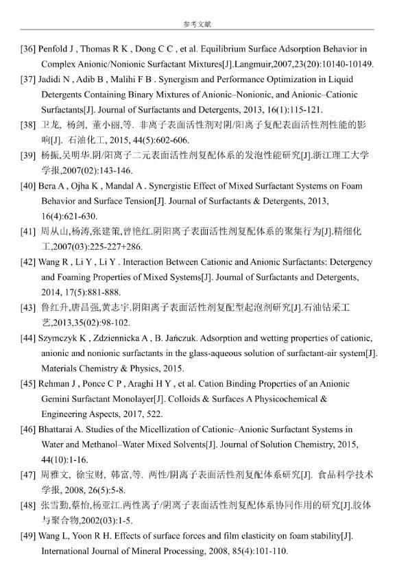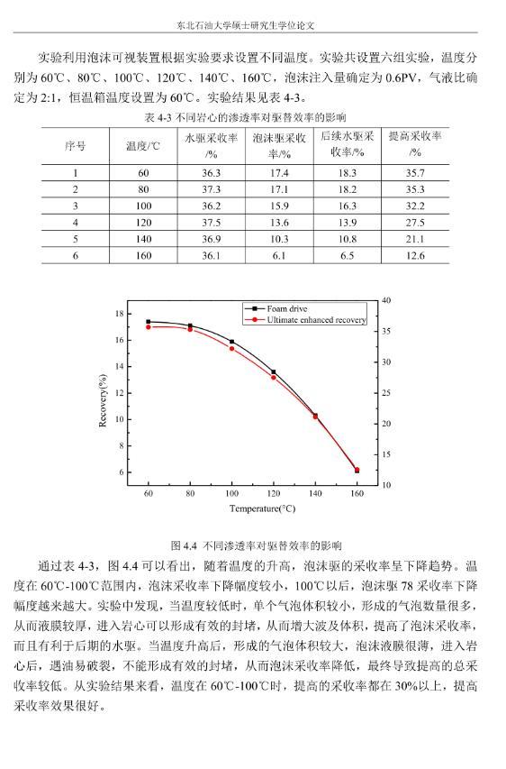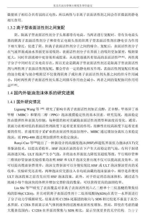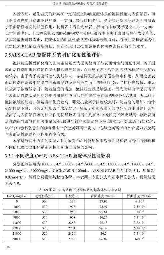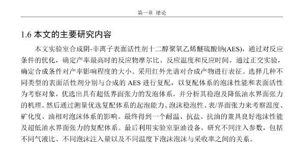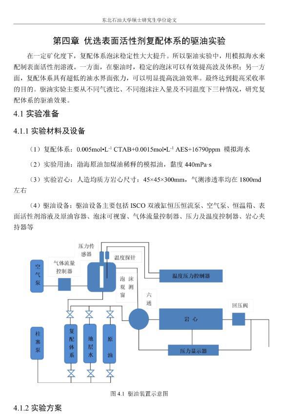 【摘要】:泡沫驱具有良好的驱油性能,在提高采收率方面备受关注。在泡沫驱油过程中,能够明显降低注入流体的流度,改善流度比,降低流体的相对渗透率,延缓注入流体的突破时间,封堵高渗层的大孔道,改变液流的方向,较好地实现封堵作用。但泡沫作为一种热力学不稳定流体,其稳定性受许多因素的影响,包括遇油快速消泡、在高温和高矿化度的情况下极易破裂等,泡沫稳定性已成为泡沫驱油时亟待解决的问题。另外,用于泡沫驱的泡沫体系很难兼具超低界面张力和稳定泡沫两种性能,而且文献报道对这方面的研究较少,这为本文提供了一个新的思路。实验室合成阴-非离子型表面活性剂十二醇聚氧乙烯醚硫酸钠(AES)。AES同时具有阴离子和非离子两种表面活性剂的性能,具有很好的泡沫性能和表面活性,同时与其它表面活性剂具有很好的相容性。最终确定的合成条件为:十二醇聚氧乙烯醚和氨基磺酸的摩尔比为1:2,反应温度为95℃,反应时间为60min。在合成AES的基础上,选择几种不同类型的表面活性剂进行复配,优选出泡沫性能和表面活性优良的体系,进行耐温、耐矿化度及耐油性能的评价。实验采用Waring-Blender法测量泡沫的起泡体积和半衰期,采用吊环法和旋转滴法测量复配体系的表面张力与油水界面张力。实验最终优选出泡沫性能与表面活性优良的AES-CTAB复配体系,并确定其最佳复配摩尔比为3:1,最佳总浓度为0.02mol·L-1。复配体系耐温200℃,耐质量分数20%的原油,矿化度增加可以提高复配体系的泡沫稳定性和表面活性。实验从气液比、泡沫注入量和温度三个方面对泡沫提高采收率的影响进行研究。最佳气液比为2:1,最佳泡沫注入量为0.6PV,泡沫采收率随温度的提高逐渐下降,在60-100℃范围内泡沫在水驱后提高采收率在30%以上。