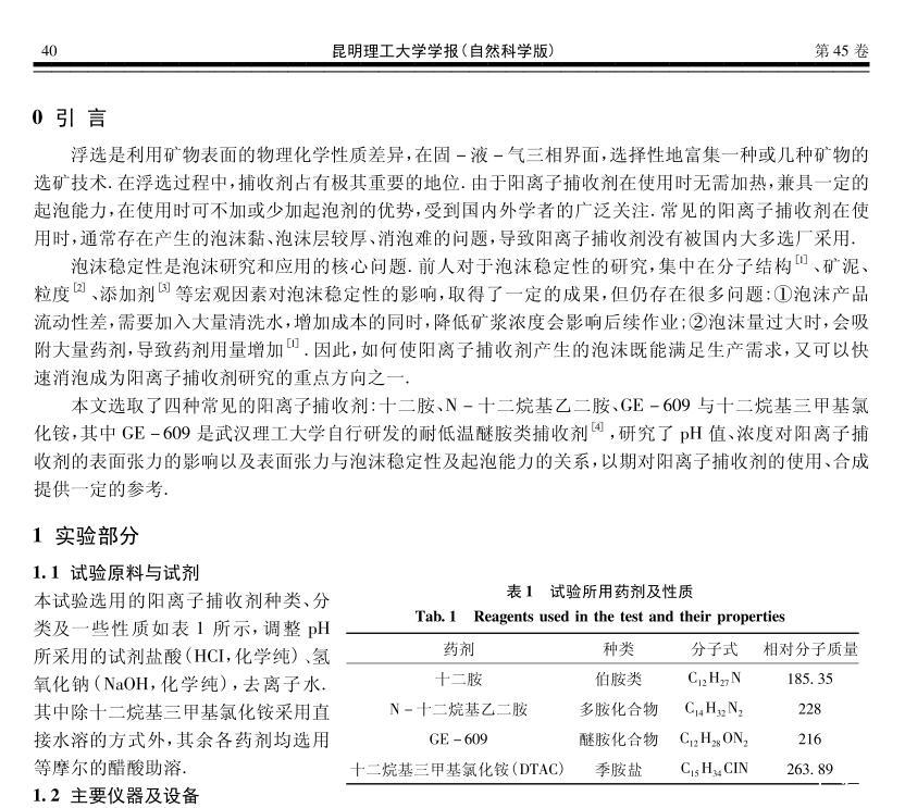 四种阳离子捕收剂的起泡性能与表面张力研究