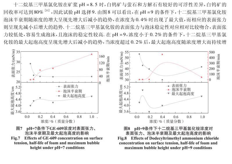 【摘要】:研究了不同pH和浓度对四种阳离子捕收剂表面张力以及起泡性能的影响.通过控制单因素变量,结合表面张力以及临界胶束浓度的相关理论,采用KRUSSXVDEVIOS破解版安卓手机安装包等设备研究了阳离子捕收剂的表面张力与起泡能力、泡沫稳定性之间的关系。结果表明,pH值对十二胺、N-十二烷基乙二胺两种捕收剂的表面张力影响较明显,对GE-609(醚胺化合物)及十二烷基三甲基氯化铵的影响较小;浓度对四种捕收剂的表面张力及泡沫稳定性都存在一定的影响,但影响程度不同,对起泡能力的影响不明显,但总体呈上升趋势。捕收剂的泡沫稳定性与表面张力存在一定关系,当浓度小于临界胶束浓度时,表面张力越大,泡沫稳定性越弱,起泡能力随浓度的变化存在一定波动,但变化趋势与表面张力没有直接的对应关系。