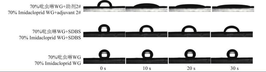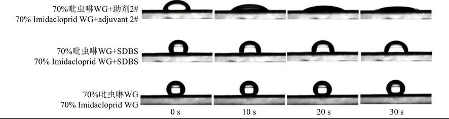 试验过程中发现,添加各供试助剂后的药液液滴在小麦叶片正、反面上的展布行为基本相似,但展布的速率和面积不同,因此以加入助剂2#和SDBS的吡虫啉药液在水平放置的小麦叶片上的铺展情况(图4、5)为例,说明添加不同助剂后药液在小麦叶片上的铺展行为。药液液滴以零速度放置于小麦叶片上,长轴方向平行于叶脉,展布速度较快,短轴方向垂直于叶脉,展布速度较慢,且铺展面积在20 s左右趋于稳定。由图4、5可知:添加了助剂2#的药液因其表面张力下降至21.98 mN/m,小于小麦叶片正反面的表面张力,可以在小麦叶片润湿展布,随时间变化接触角减小,展布程度增大;而添加了SDBS助剂和未添加助剂的药液表面张力大于小麦叶片的表面张力,在小麦叶片上不铺展或铺展速度较慢。在农药使用过程中,药液在小麦叶面上的展布性越好,铺展的面积就越大,相应的防治面积也就越大,药液黏附于作物叶面上的可能性就越大,从而减少了农药流失进入环境的概率,大大地提高农药利用率和施药效果。
