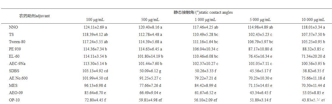 表3不同质量浓度的助剂溶液在小麦叶正面上的静态接触角(mean±SD,n=5)