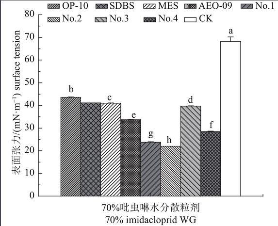 表面张力的大小直接决定了农药制剂在稀释后能否完全润湿展布在植物表面上,而降低表面张力的常用方法就是在制剂中添加助剂。本次试验通过添加不同助剂测定了供试农药表面张力值的变化,结果如图2所示。70%吡虫啉WG药液的表面张力值为(68.21±2.03)mN/m,加入助剂后显著降低了药液的表面张力,且不同助剂对同一种药液的表面张力降低趋势存在显著差异。其中,筛选出的8种助剂中,助剂1#和2#对药液表面张力下降趋势最大,效果最好,降低率分别可达65.13%和67.78%;其次是助剂4#、助剂3#、AEO-09和SDBS,降低率范围在32.84%~63.96%;脂肪酸甲酯磺酸钠和OP-10较差,但降低率也可达26.58%以上。加入助剂1#、2#和4#后,药液的表面张力降低至小麦叶片正面的临界表面张力(33.88 mN/m)以下,能较好润湿展布在小麦的叶片正、反面上,极大地增加施药效果。