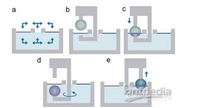 交替型XDEVIOS官方免费版安装的镀膜过程如图3所示。当使用两个单分子层压缩沉积池和一个空白沉积池时,可实现交替镀膜,浸渍过程可在3个沉积池中选择任意路径多次循环(图3a);在共同的亚相(浅蓝色)上方,有两种不同的单分子层(紫色和深蓝色)(图3b);上臂将样品向下通过单分子膜,由下臂接住样品。沉积循环也可从亚相开始,进行第一层镀膜(图3c);下臂可根据需要旋转到另一单分子层的沉积池或空白沉积池中,改变沉积池(图3d);下臂提起样品,传递给上臂(样品从任意一侧通过两个单分子层中任意一个),进行第二层镀膜(图3e)。