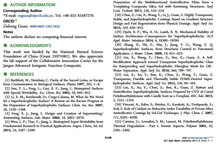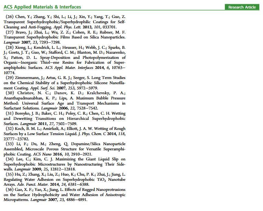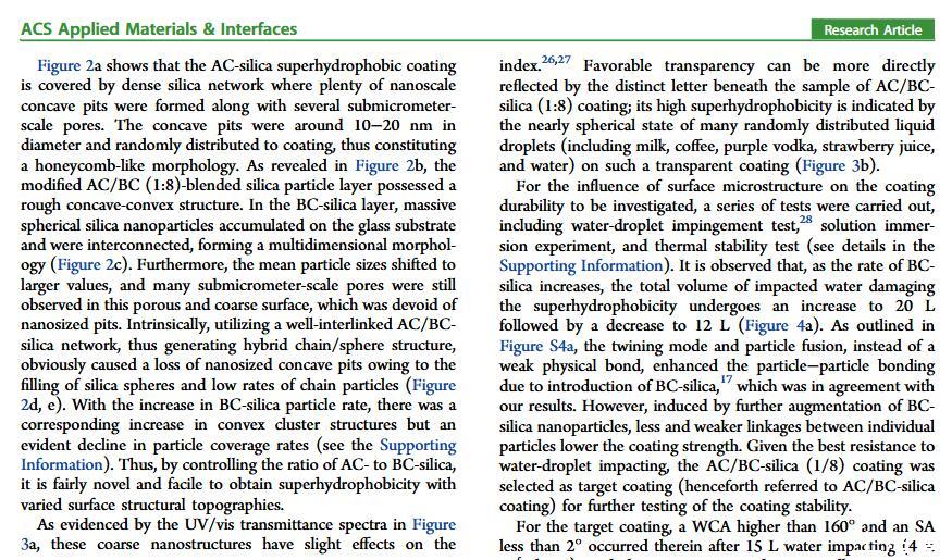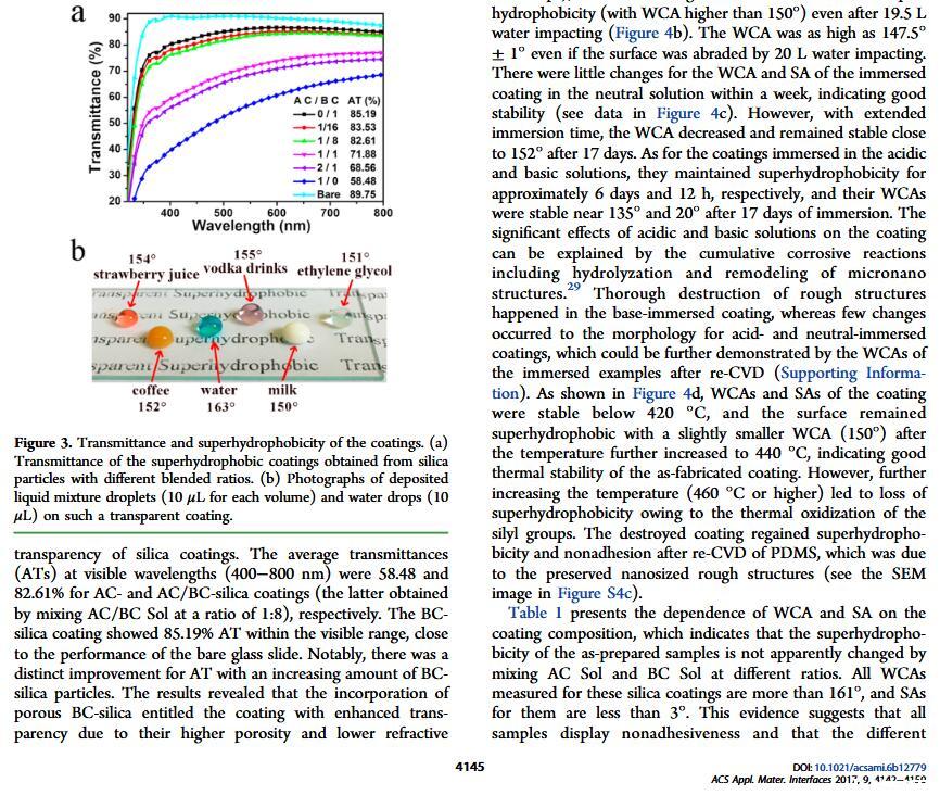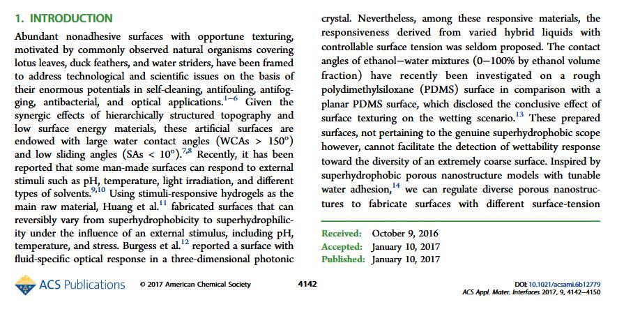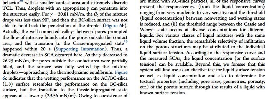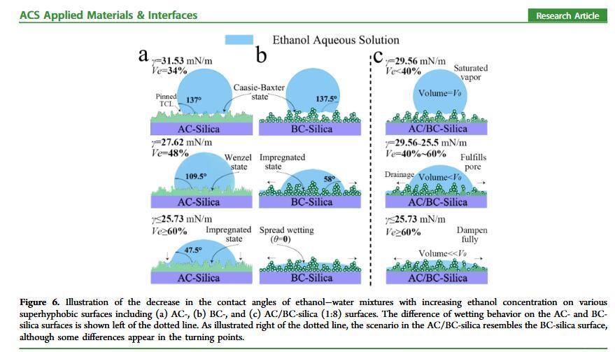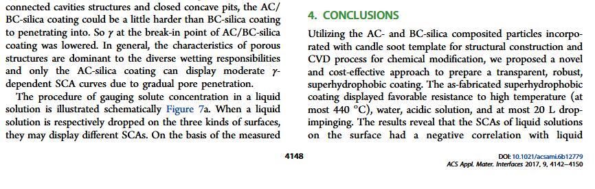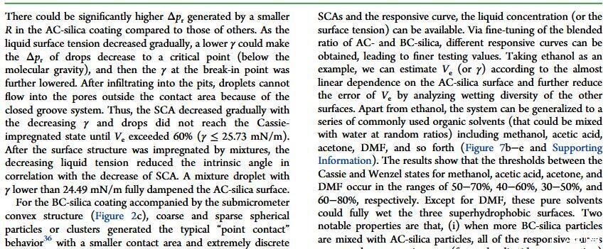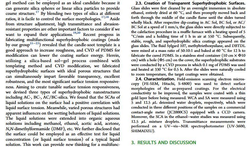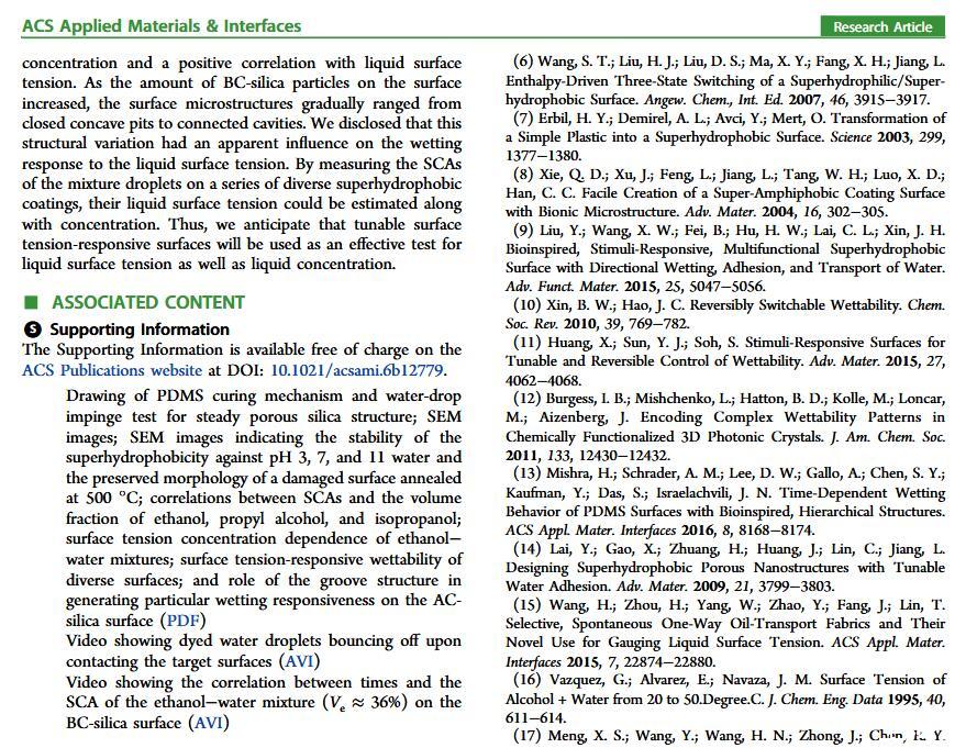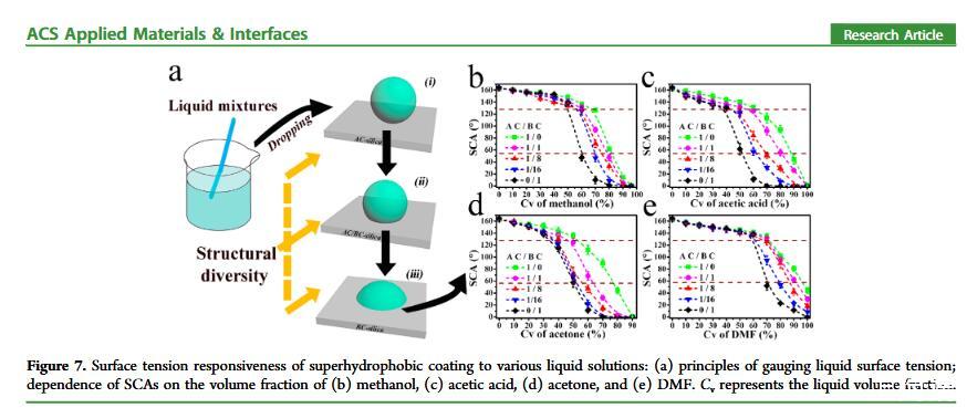 当液体的表面张力发生变化时,它在普通固体表面的润湿性也会随着变化。然而,关于这一规律以及尤其是在超疏水表面的表现的研究很少。最近,协同创新中心PI-6管自生老师课题组研究生王研等人利用上述的表面张力和润湿性的响应关系首次将透明超疏水涂层应用在探测液体表面张力方面,为拓宽多功能超疏水涂层的应用提供了一个新的思路,相关论文已被ACS applied materials&interfaces发表。研究表明,随着有机物水溶液中有机物体积分数上升,溶液的表面张力相应地下降,溶液液滴在制备的超疏水涂层的接触角也逐渐下降,此称之为表面润湿性对表面张力的响应。基于此响应关系,可以通过接触角估测液体的表面张力以及有机物的浓度。