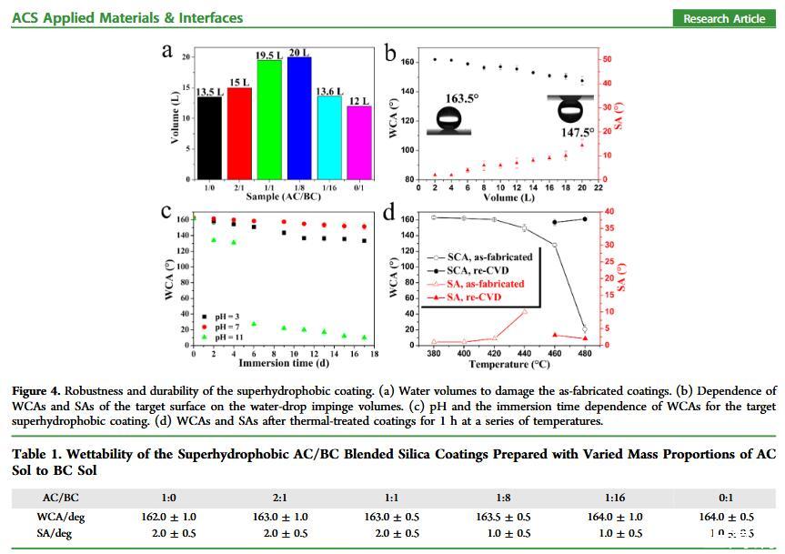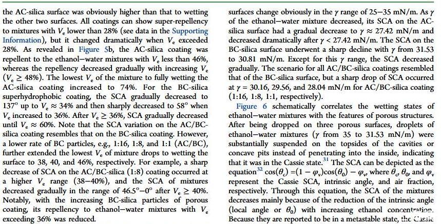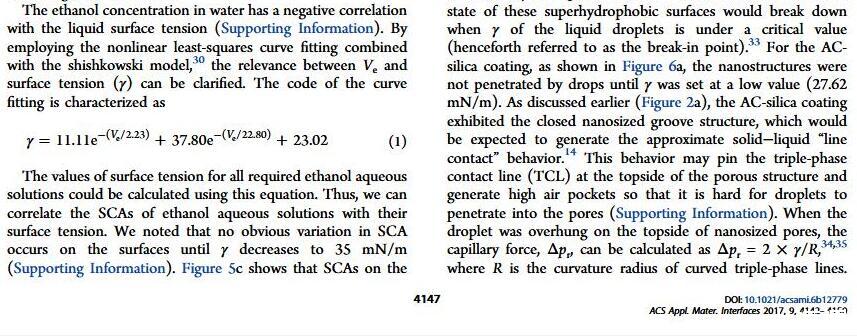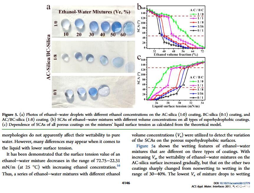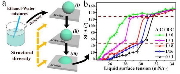 结果表明,以正硅酸四乙酯为前驱体通过酸性和碱性水解法制备了不同形貌的纳米二氧化硅溶胶,通过混合两种溶胶可制备出具有颗粒间键桥强度高的亚微米级凸起和纳米级凹坑的结构的涂层。通过控制酸碱催化溶胶混合比例,XVDEVIOS官方下载免费版可以制备出具有不同微观结构的超疏水涂层。结果表明具有不同结构的涂层具有不同的润湿性-表面张力关系,随着涂层制备时碱催化溶胶的比重增加,纳米级凹坑结构逐渐减少,表面更容易被低表面张力液体侵入,因而接触角下降更剧烈。并且在有机物水溶液,包括:甲醇、乙醇、正丙醇、异丙醇、乙酸、丙酮、N,N’-二甲基酰胺等,都具有同样的接触角和浓度(表面张力)响应规律。