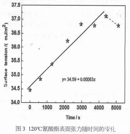 作者认为在较长的未固化的时间段内,树脂表面张力呈线性增加,可能是由于局部官能团反应使体系相变,表面能变化较大导致的表面能增加。