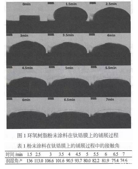 杨雲予等人利用接触角测量仪在恒温180℃下,拍出了不同时刻圆柱状粉末涂料在铝合金钛锆膜上的熔融和铺展过程图,并记录了的润湿角,为研究粉末涂料固化过程中,凝胶前的接触角变化提供了依据。