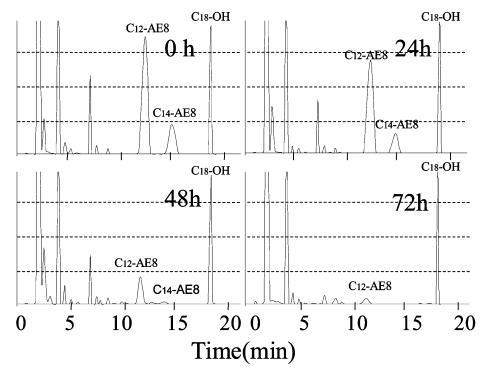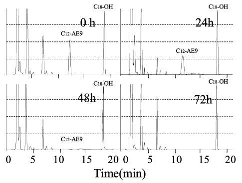 用高效液相色谱法分析生物降解过程中AE 的色谱图如图8 所示,其中10 毫克/升C12-AE9 的峰出现在11 分钟的保留时间,作为内标的C18 醇出现在18 分钟的保留时间。 在 8 分钟的保留时间之前观察到主要由衍生产物引起的干扰峰。 10mg/L AE9 的大部分峰在 48 小时后消失(图 8),而图 3 中此时基于需氧量的生物降解保持 35%。此时表面张力值达到约 72.8 mN/m . 因此,表明AE9在其生物降解率低于50%的时间内失去了其界面活性和水生毒性。