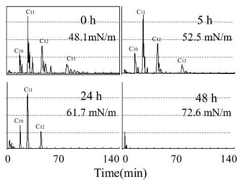 图 11 驯化测试期间重新添加后 10 mg/L LAS 的色谱图。 描述了重新添加后的时间和当时的表面张力。