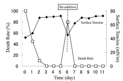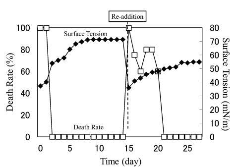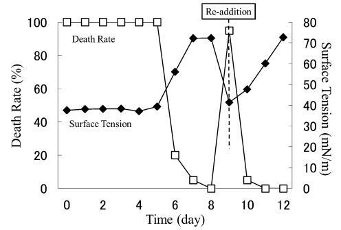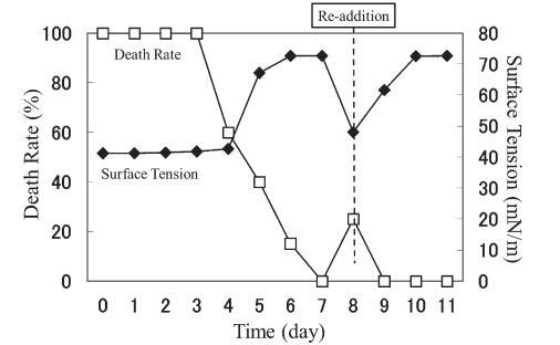结果,在第8天重新加入LAS使试液的表面张力降低到与初始阶段相同的水平,但死亡率没有达到100%。 重新添加后不久,观察到表面张力值迅速增加,水生毒性和死亡率迅速下降。 重新添加 LAS 后,死亡率暂时增加,但随后立即降至 0%。 重新添加后第 2 天,表面张力值达到约 72.8 mN/m。