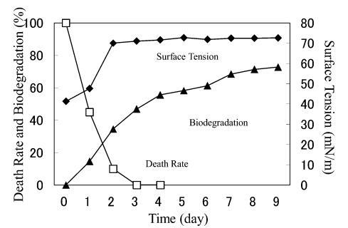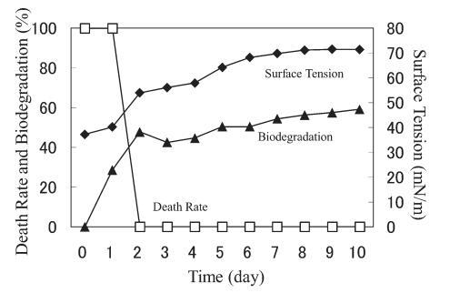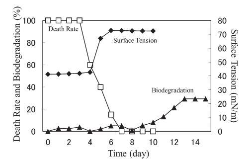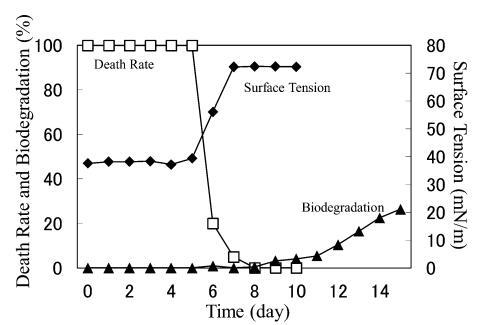 由于AE8用于商业产品,XVDEVIOS官方下载免费版使用AE8来比较另一种AE。 20 mg/L AE8(图5)的结果与20 mg/L AE9(图4)的结果相似。 20 mg/L AE8 的死亡率随着表面张力和生物降解率的增加也迅速下降。 测试开始后,表面张力值立即开始增加,并在第 6 天达到约 72.8 mN/m。 该结果与之前的报告 9) 以及 20 mg/L AE9 的结果相似(图 4)。 BOD在1-2天内开始增加,并在3天后继续逐渐增加。 至于死亡率,4天后略有增加,可能是溶解氧不足所致。