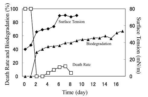 在 10 mg/L AE9 的情况下,在第 6 天进行重新添加,因为此时死亡率和表面张力已稳定下来。 重新添加后第2天表面张力恢复到蒸馏水的水平,死亡率在暂时增加到80%后立即下降到0%(图14)。 因此得出结论,AE9 在重新添加后 24 小时内发生了初级生物降解,这表明驯化加速了 AE9 的初级生物降解。