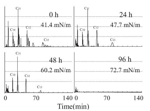 图 13 驯化试验期间重新添加 20 mg/L LAS 后的色谱图:描述了重新添加后的时间和当时的表面张力。