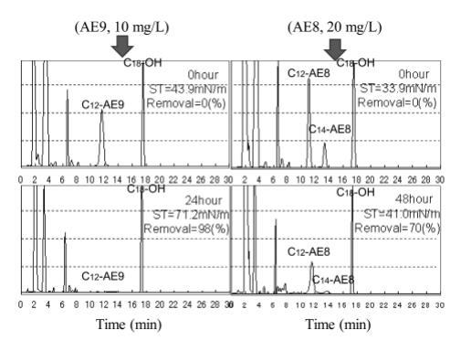 对于20 mg/L AE8,根据表面张力和死亡率的变化在10天时重新添加,趋势与20 mg/L AE9的情况相似。 在重新添加后 48 小时观察到 20 mg/L AE8 的 HPLC 峰,峰面积表明此时保留了约 30% 的 AE8(图 17)。 这一事实表明,如果 AE 的浓度增加超过 20 毫克/升,重新添加后 AE 的生物降解速度相当缓慢。 可以假设 20 mg/L AE 的负载对于本研究中的细菌活性来说太重了。 然而,如果浓度低于 10 毫克/升,无论有没有驯化,都获得了极好的生物降解性。