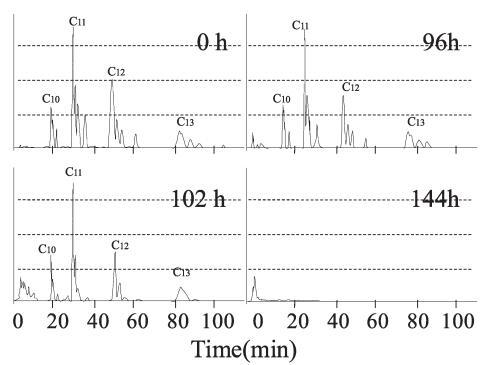 生物降解过程中10mg/L LAS的色谱图,通过HPLC使用UV检测器进行分析,如图6所示。在相应的保留时间(RT)处出现不同碳链数的峰组:16至19.5分钟为C10,26.5至32.5分钟是C11,44到55分钟是C12,74到95分钟是C13。 由于苯基的结合位置不同,每个峰组都包含异构体峰。 参考标准(和光纯药工业株式会社)用于识别每个峰。