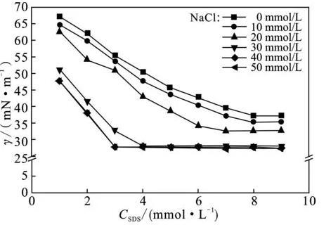 这是由于当无机盐添加浓度未达上限值时,由于反离子的加入可以降低表面活性离子之间的静电斥力,而无机盐浓度越高,反离子浓度越大,导致表面活性离子之间的静电斥力降低程度越大,从而使得表面张力越小,如图1所示。而当超过无机盐添加浓度上限时,表面张力达到稳定,其可能的原因是反离子和表面活性剂分子在有限数量空位的表面已达近饱和状态,导致静电斥力的降低程度达到最大。