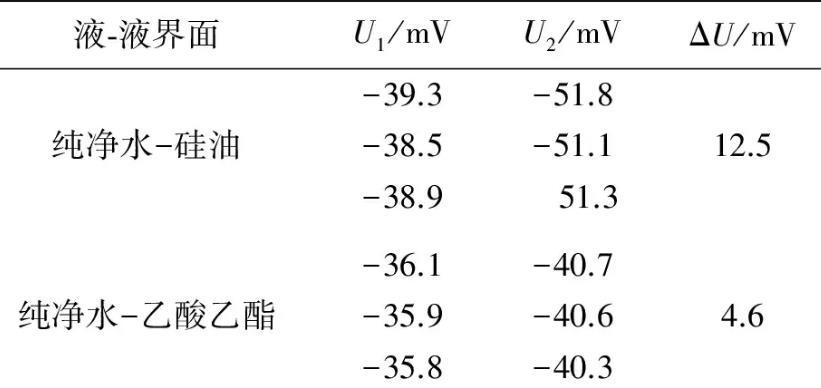 实验测量所用金属吊环的外径、内径分别为0.034 96 m和0.033 10 m.在20℃实验条件下,采用自制2种液体间界面张力的动态实时测量仪,测量了纯净水-硅油和纯净水-乙酸乙酯间的界面张力.测量出金属吊环由液体I中完全进入液体Ⅱ的过程中,液体I的液膜被拉断前电压的最大值U1,拉断后趋于稳定时的电压值为U2,数据结果如表1所示。