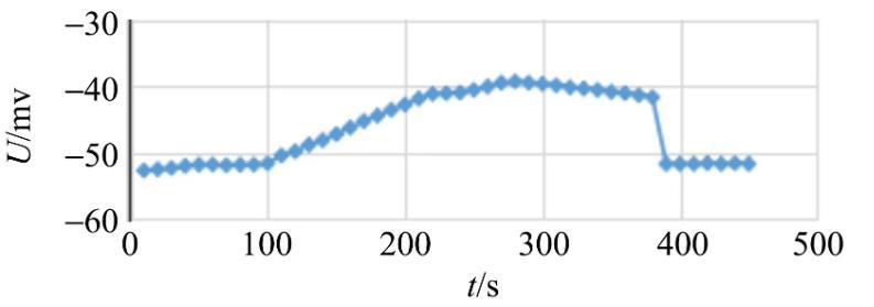 实验过程:接通电源,将仪器预热15min;在传感器横梁端头的小钩上挂砝码盘并进行定标;将金属吊环清洁干净,调平后挂在传感器的小钩上;实验时,先将吊环置于密度较大的液体Ⅰ中,然后再注入密度较小的液体Ⅱ,调节流速调节器控制从容器底部缓慢匀速排出液体的流速,测量出电压U随时间t的变化曲线。图2为纯净水和硅油的界面张力测量过程中电压U随时间t的变化曲线。