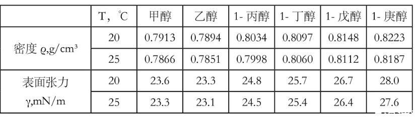 表2醇类在不同温度下的密度和表面张力