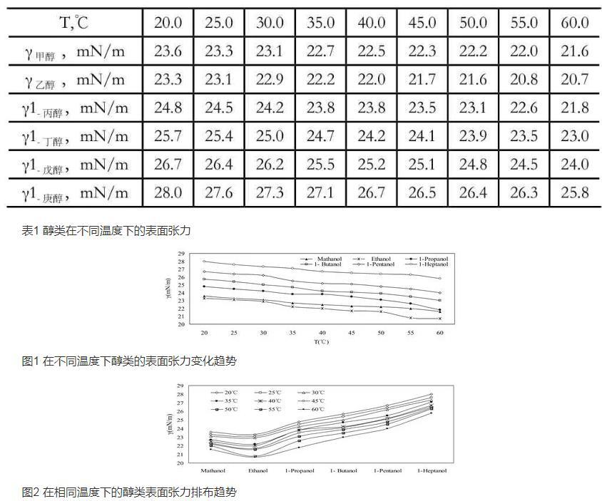 表1醇类在不同温度下的表面张力