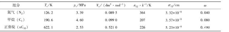 Zhang等[11]设计出纳米实验装置,并测量甲烷-正葵烷(C1-nC10)和氮气-正葵烷(N2-nC10)混合物在纳米孔(rp=50 nm)中的界面张力,其具体测量值见表1。对比实验测量的界面张力与模型预测值,是检验建模正确性的重要方法之一。因此,笔者对不同温度下的C1-nC10和N2-nC10混合物的界面张力进行预测,其使用到的纯组分状态方程参数列于表2。